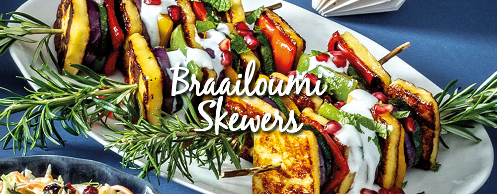 - Thread vegetables and braailoumi alternately onto rosemary stems or skewers.