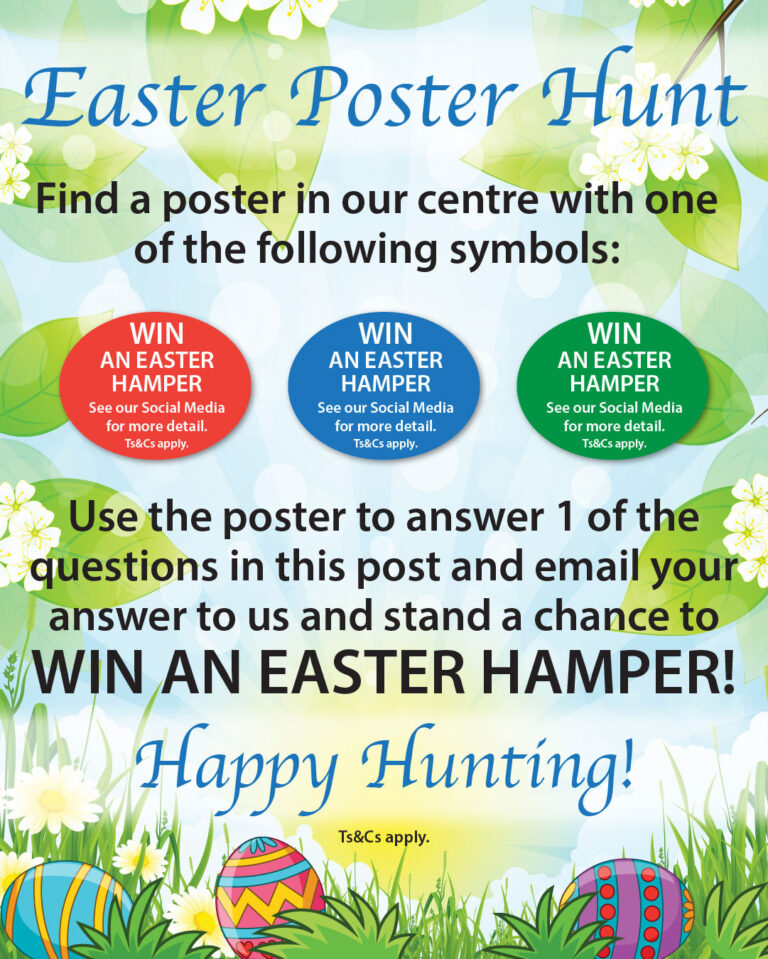 Find a poster in our centre with a red, blue or green “WIN AN EASTER HAMPER” badge and use the poster to answer 1 of