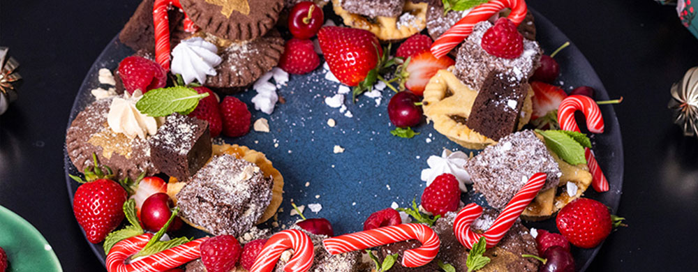 - Arrange mince pies and lamingtons in a circle on a large round platter, forming the base of your wreath.